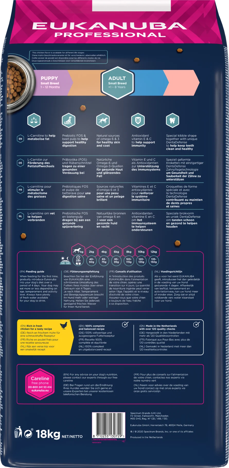 Eukanuba dry food kibbles are rich in fresh chicken and perfect for small sized adult dogs aged from 1 to 8 years. L-Carnitine contained in Eukanuba dry food supports the reduction of body fat and allows your dog to maintain an optimal weight resulting in less strain on the joints. The tailored fibre blend of prebiotic FOS and beet pulp promotes healthy digestion. Furthermore, the Eukanuba kibbles are beneficial for healthy skin and a shiny coat thanks to the natural sources of omega 6 and omega 3. The food also contains antioxidants vitamin E & C to help support the dog's immune system. Additionally, the unique Eukanuba hexagonal kibbles and DentaDefense dental care system support clean, healthy teeth in the long term. The food is 100% complete and balanced. Advanced nutrition for small sized adult dogs to support optimal body condition and lifelong wellbeing.