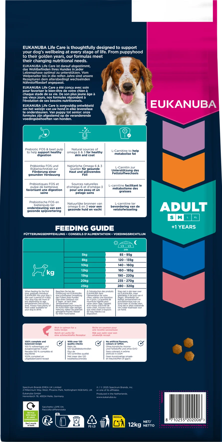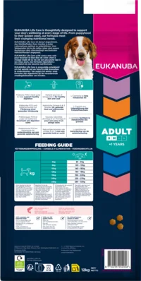 EUKANUBA Life Care provides science-backed premium nutrition, thoughtfully designed to meet the evolving needs of dogs at every stage of life. This dry food, featuring kibble rich in salmon and barley, is an excellent choice for active adult dogs of small and medium breeds aged 1 year and older. The tailored fibre blend of prebiotics and beet pulp supports healthy digestion, while high-quality salmon and chicken deliver protein to help build strong, lean muscles. The inclusion of L-Carnitine helps metabolise fat, enabling your dog to maintain an optimal weight and reducing strain on their joints for improved mobility. Our unique hexagonal kibbles, combined with the DentaDefense dental care system, promote clean, healthy teeth and help reduce tartar buildup over time. Natural sources of omega-6 and omega-3 fatty acids support healthy skin and a shiny coat. This 100% complete and balanced recipe provides advanced nutrition tailored to the needs of small and medium-breed adult dogs. Trust EUKANUBA to support your dog’s health, vitality, and overall wellbeing.