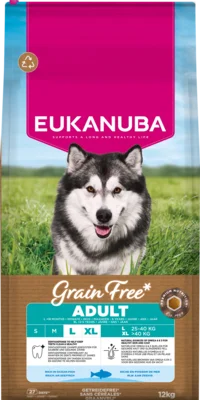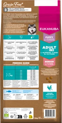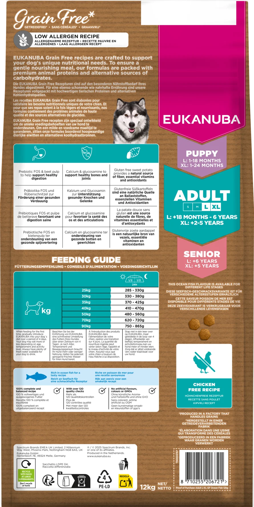 This EUKANUBA Grain Free* dry food is specially formulated for large breed adult dogs aged from 18 months to 6 years (or 2 to 5 years for giant breeds). Its low allergen recipe, rich in ocean fish, is carefully designed for dogs with grain sensitivities, supporting their unique nutritional needs. The chicken-free formula offers a wholesome meal with alternative carbohydrate sources, including peas and gluten free* sweet potato, which provides natural fiber, essential vitamins and antioxidants. Packed with ocean fish, it also supplies your dog with high-quality animal protein necessary for building and maintaining strong, lean muscles. To further support a healthy digestion, the food contains prebiotics FOS and beet pulp. In addition to this, natural sources of omega-6 and -3 fatty acids promote a healthy skin and shiny coat, while calcium and glucosamine support healthy bones and joints, contributing to your dog's overall mobility. Moreover, the unique kibble shape, combined with the DentaDefense dental care system, helps to maintain clean and healthy teeth. This 100% complete and balanced diet provides advanced nutrition for large-sized adult dogs, supporting optimal body condition, lifelong health, and overall wellbeing. Trust EUKANUBA to deliver high-quality nutrition tailored to meet your dog's dietary needs.