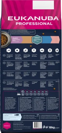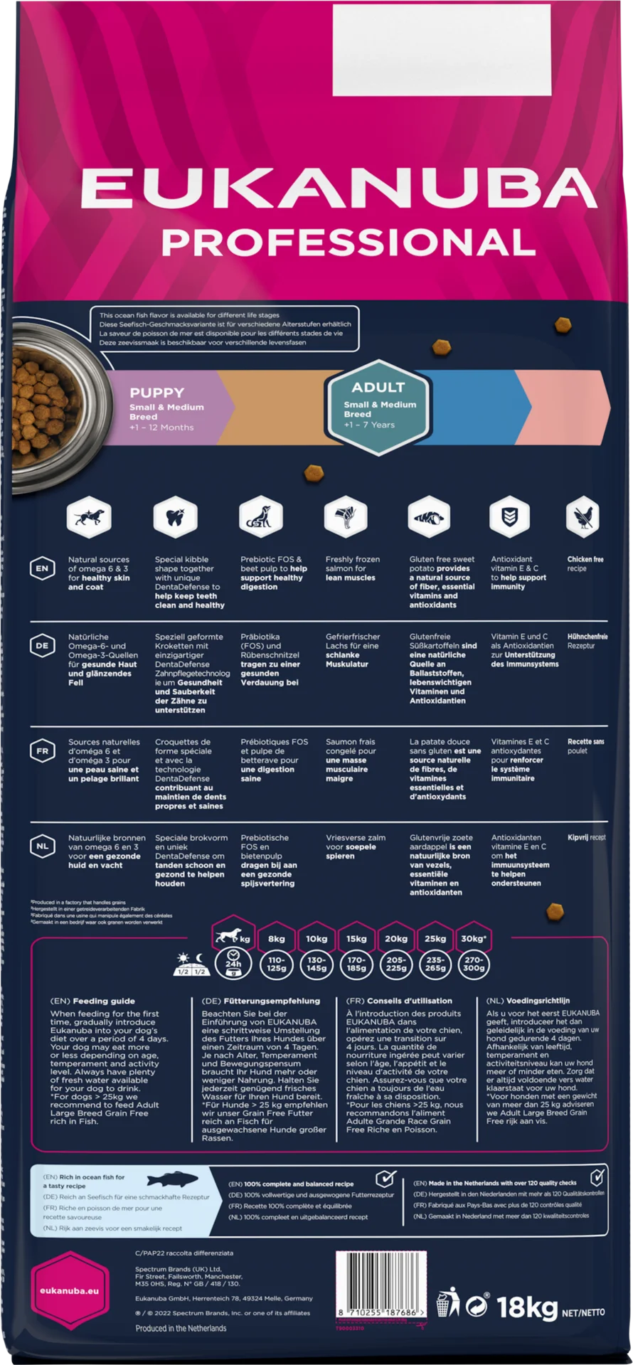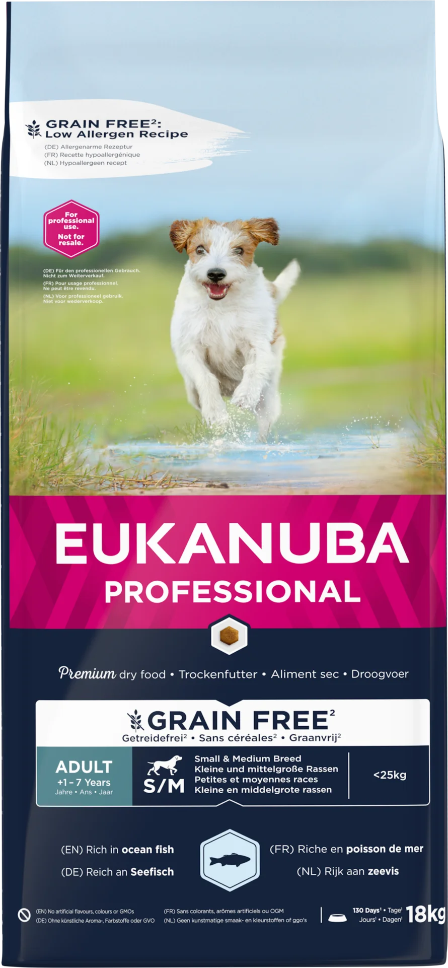 Eukanuba Grain Free* for Adult dogs of Small and Medium Breeds is a Low Allergen recipe that is carefully crafted to avoid common allergens. The gentle formula contains gluten free* sweet potato providing a natural source of fiber, essential vitamins and antioxidants. The chicken free recipe contains only fish as a source of animal protein. Rich in Ocean Fish and with freshly frozen Salmon, this food provides your dog with the animal protein needed to build and maintain strong and lean muscles. To further support a healthy digestion, the food contains prebiotics FOS and beet pulp. Peas and sweet potato serve as an alternative source of carbohydrates. In addition to this, natural sources of omega-6 and -3 fatty acids promote a healthy skin and radiant coat. Moreover, our recipe tailored for Adult dogs of Small and Medium Breeds uses a special kibble shape together with unique DentaDefense to help keep teeth clean & healthy. Eukanuba Grain Free* for Adult dogs of Small and Medium Breeds is 100% complete and balanced to make your dog feel good.