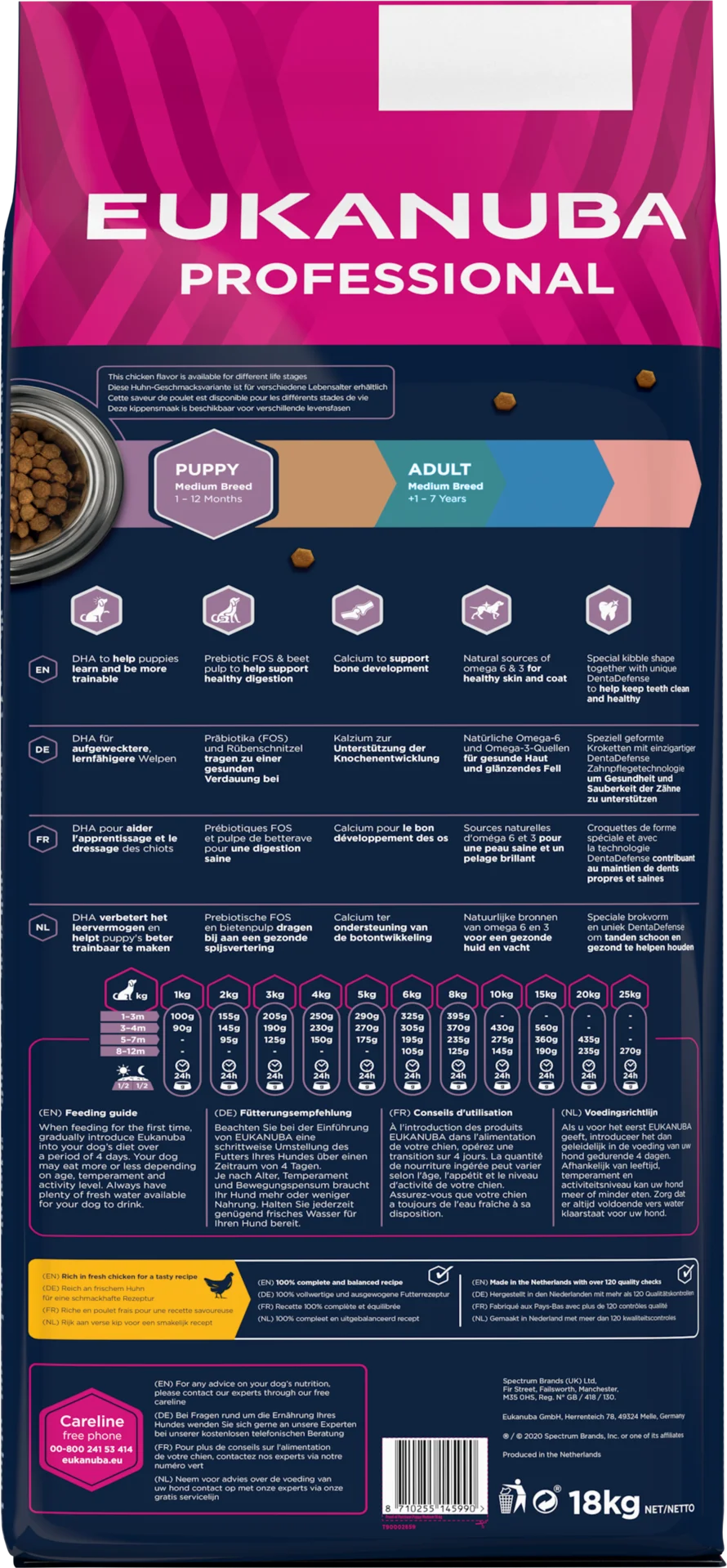 Eukanuba dry food kibbles are rich in fresh chicken and perfect for puppies of medium sized breeds aged from 1 to 12 months. The selected ingredients provide tailored nutrition to support your puppy's growth and development. Eukanuba dry food contains DHA to stimulate puppies to learn and be more trainable as well as calcium which is favourable for bone development. The tailored fibre blend of prebiotic FOS, MOS & beet pulp promotes healthy digestion. The Eukanuba kibbles are furthermore beneficial for healthy skin and a shiny coat thanks to the natural sources of omega 6 and omega 3. Additionally, the unique Eukanuba hexagonal kibbles and DentaDefense dental care system support clean, healthy teeth in the long term. The food is 100% complete and balanced. Advanced nutrition for puppies of medium sized breeds to support optimal body condition and lifelong wellbeing.