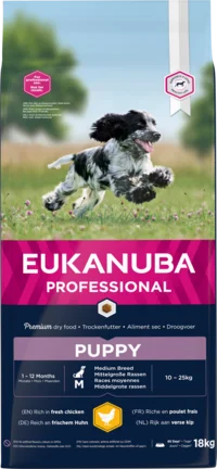 EUKANUBA dry dog food kibbles for puppies of medium breeds that are rich in fresh chicken