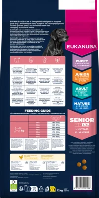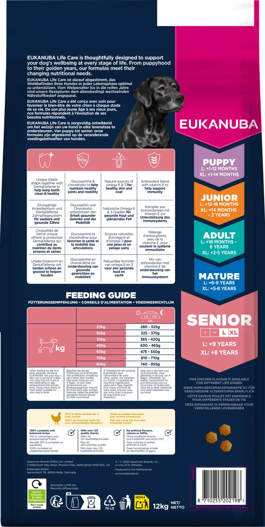 EUKANUBA Life Care offers science-backed premium nutrition, carefully crafted to meet the evolving needs of dogs through every stage of life. This dry food rich in fresh chicken is specially formulated for large-sized senior dogs aged from 9 years on (or 8+ years for giant breeds). With selected ingredients, it provides tailored nutrition to support healthy aging and overall vitality. L-Carnitine helps with weight management, allowing your dog to maintain an optimal weight and reducing strain on the joints. The tailored fibre blend of prebiotic FOS, MOS and beet pulp promotes healthy digestion, while glucosamine and chondroitin support healthy joints and calcium ensures strong bones. Natural sources of omega-6 and omega-3 fatty acids promote healthy skin and a shiny coat, while an antioxidant blend with vitamin E helps strengthen your dog’s immune system. Additionally, the unique EUKANUBA hexagonal kibbles, combined with the DentaDefense dental care system, help maintain clean, healthy teeth over the long term. This 100% complete and balanced diet delivers advanced nutrition to support optimal body condition and lifelong wellbeing for large-sized senior dogs. Trust EUKANUBA to deliver high-quality nutrition tailored to every stage of your dog’s life.