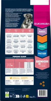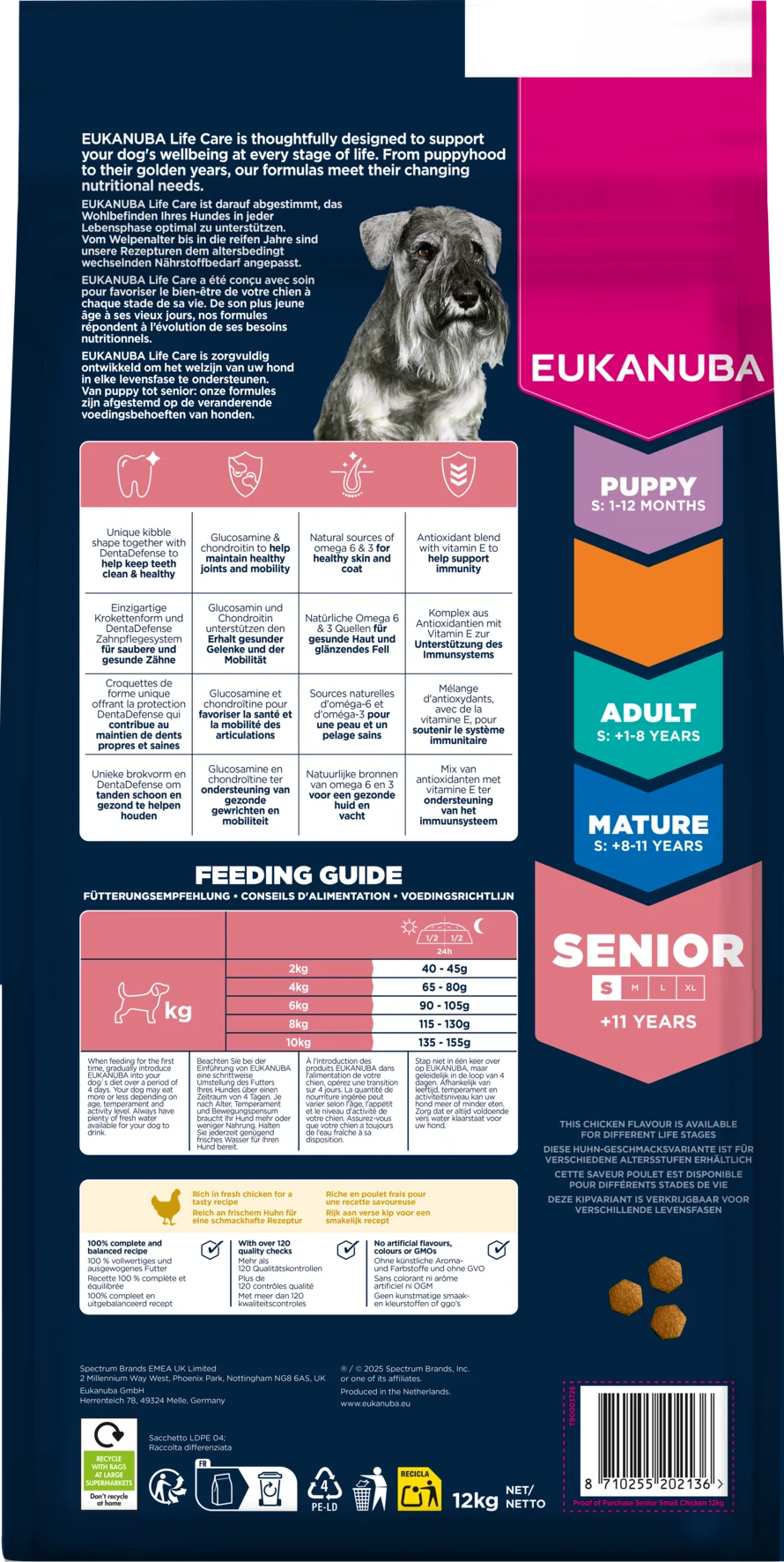 EUKANUBA Life Care offers science-backed premium nutrition, carefully crafted to meet the evolving needs of dogs through every stage of life. This dry food rich in fresh chicken is specially formulated for small-sized senior dogs aged from 11 years on. With selected ingredients, it provides tailored nutrition to support healthy aging and overall vitality. L-Carnitine helps with weight management, allowing your dog to maintain an optimal weight and reducing strain on the joints. The tailored fibre blend of prebiotic FOS, MOS and beet pulp promotes healthy digestion, while glucosamine and chondroitin support healthy joints and calcium ensures strong bones. Natural sources of omega-6 and omega-3 fatty acids promote healthy skin and a shiny coat, while an antioxidant blend with vitamin E helps strengthen your dog’s immune system. Additionally, the unique EUKANUBA hexagonal kibbles, combined with the DentaDefense dental care system, help maintain clean, healthy teeth over the long term. This 100% complete and balanced diet delivers advanced nutrition to support optimal body condition and lifelong wellbeing for small-sized senior dogs. Trust EUKANUBA to deliver high-quality nutrition tailored to every stage of your dog’s life.